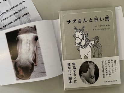 実話をもとに描かれた絵本(作くがともみ、絵イシイヒサトシ、忘羊社)。人間のつごうで命をうばわれる運命にあった白馬とひとりの調教師が起こした奇跡の物語です。